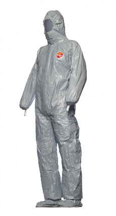 DuPont™ Tychem® 6000 F with dissipative socks. Hooded coverall with integrated socks to be worn inside shoes or boots and additional knee-length boot flaps. Available in grey in sizes SM-3X. Elasticated face, wrists and waist for an optimal fit, thumb loops prevent sleeves from riding up. Self-adhesive chin flap for tight seal of suit to face-masks.
