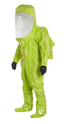 DuPont™ Tychem® 10000 Encapsulated Training Suit. Expanded Back, Front Entry. Extra-Wide Visor, 1 Layer: 20 mil PVC. Attached Butyl Gloves. Attached Socks with Outer Boot Flaps. Storm Flap. Taped Seams. Lime Yellow. Clearly Labeled as a Training Suit.