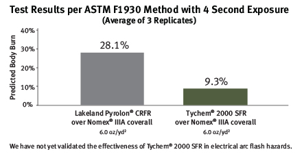 We engineered Tychem® 2000 SFR garments to perform well in flame engulfment scenarios. Extensive ASTM F1930 (instrumented thermal manikin) testing was conducted during the development of Tychem® 2000 SFR garments to aid in garment design and component selection. The final Tychem® 2000 SFR garment continues to demonstrate excellent performance when exposed to a fire engulfment. In fact, when tested side-by-side, Tychem® 2000 SFR garments yield a much lower predicted body burn level and much less afterflame than competing garments, including Lakeland Pyrolon® CRFR. The performance of the actual garment when exposed to a fire engulfment should be the key deciding point for selection of a secondary FR garment. Using ASTM F1930 testing for 4 seconds of flame exposure, when worn over Nomex® IIIA coverall 6oz/yd2, Tychem® 2000 SFR shows 9.3% body burn, versus Lakeland Pyrolon® which shows 28.1% body burn.